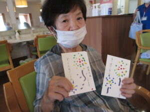 ハガキには綿棒を使った絵具で花火を描きました😊🎆💖