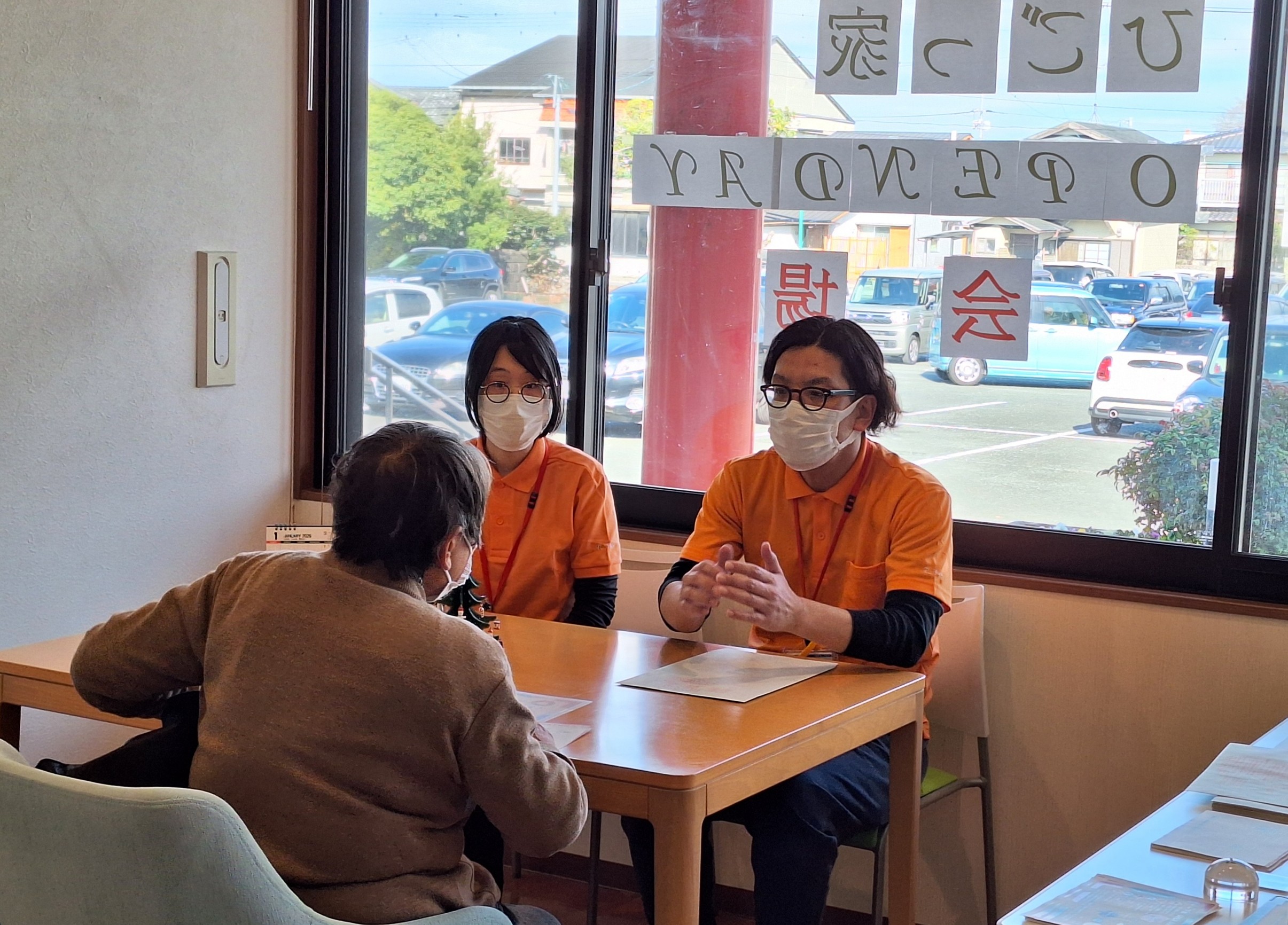 「前、温泉があった所だろ?」「名前だけは聞いた事あるけどね」等々…ひごっ家がどういう所なのかよく知らないという方もおられ、お一人ずつ丁寧に説明をしたり、介護の相談に応じたりしました。