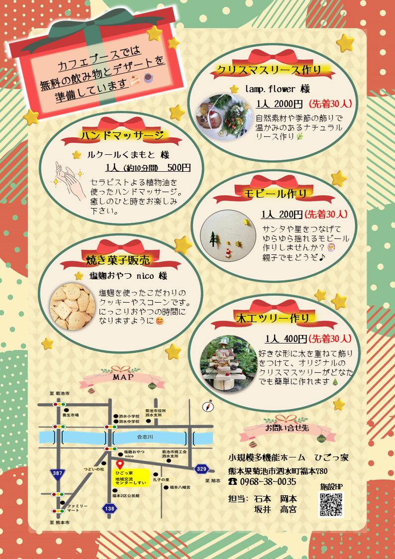 ご家族でクリスマス準備ができる体験ブース等、楽しめるコーナーをご用意しています😊菊池市の方ならどなたでもご参加可能です🎅